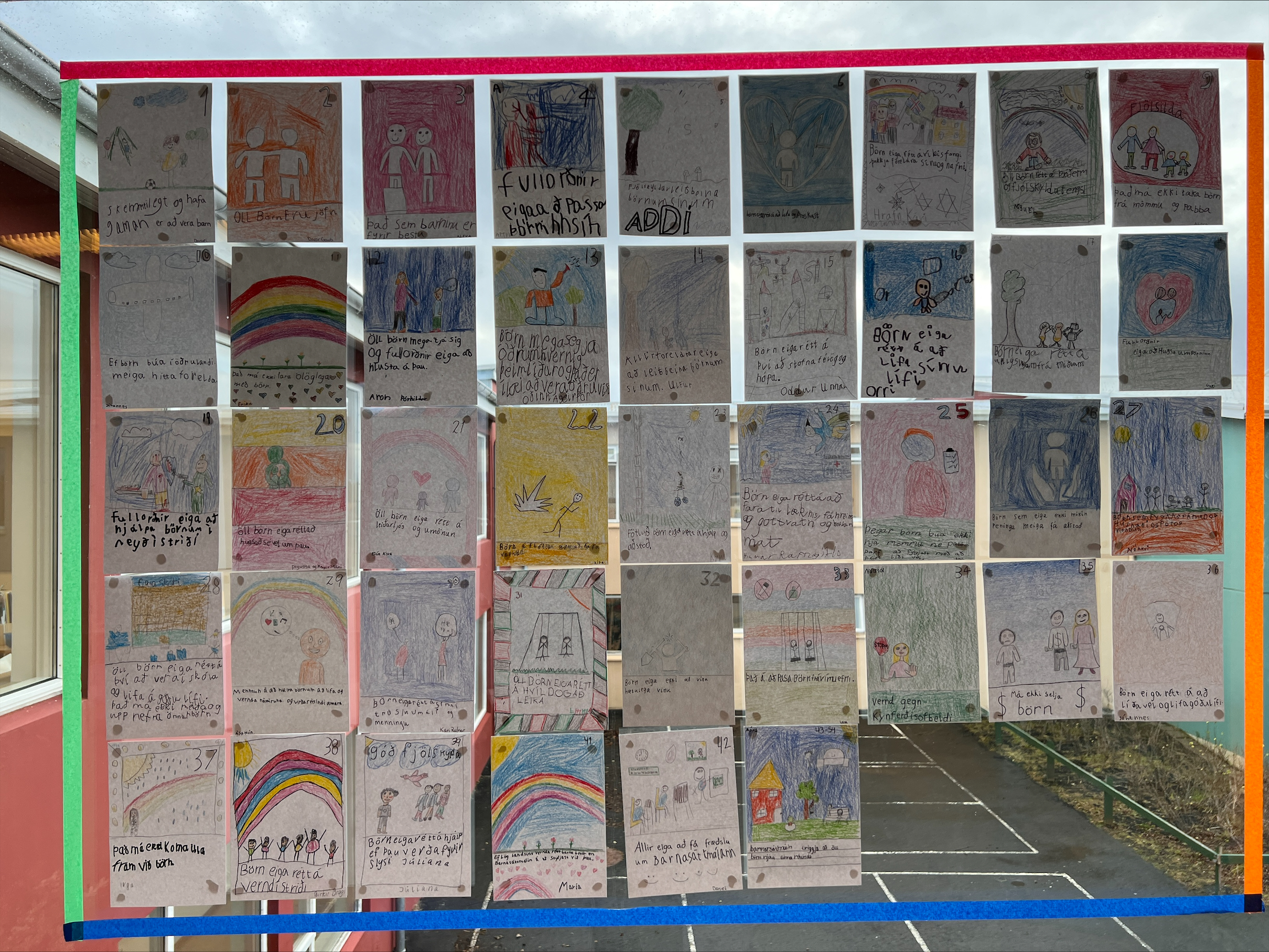 „Svo er yndislegt að labba um ganga skólanna, frístundaheimilanna og félagsmiðstöðvanna og sjá öll frábæru verkefnin sem hanga upp um alla veggi. Þetta eru verkefni sem tengjast réttindum þeirra og eru tengd við ákveðnar greinar Barnasáttmálans - nú eða bara endurgera Barnasáttmálann með sínum eigin teikningum og orðum eins og 3. bekkur í Flataskóla. Þar eru öll börn í skólanum einnig búin að vinna skólareglurnar og tengja við greinar Barnasáttmálans og réttindi barna - alveg meiriháttar.“